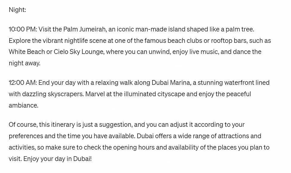 If you’re still not done for the day, and want to explore Dubai’s vibrant nightlife scene, you can visit the city’s popular beach clubs or rooftop bars located at Palm Jumeirah – an iconic man-made island shaped like a Palm. ChatGPT suggests visiting White Beach or Cielo Sky lounge to unwind, enjoy live music and dance the night away.