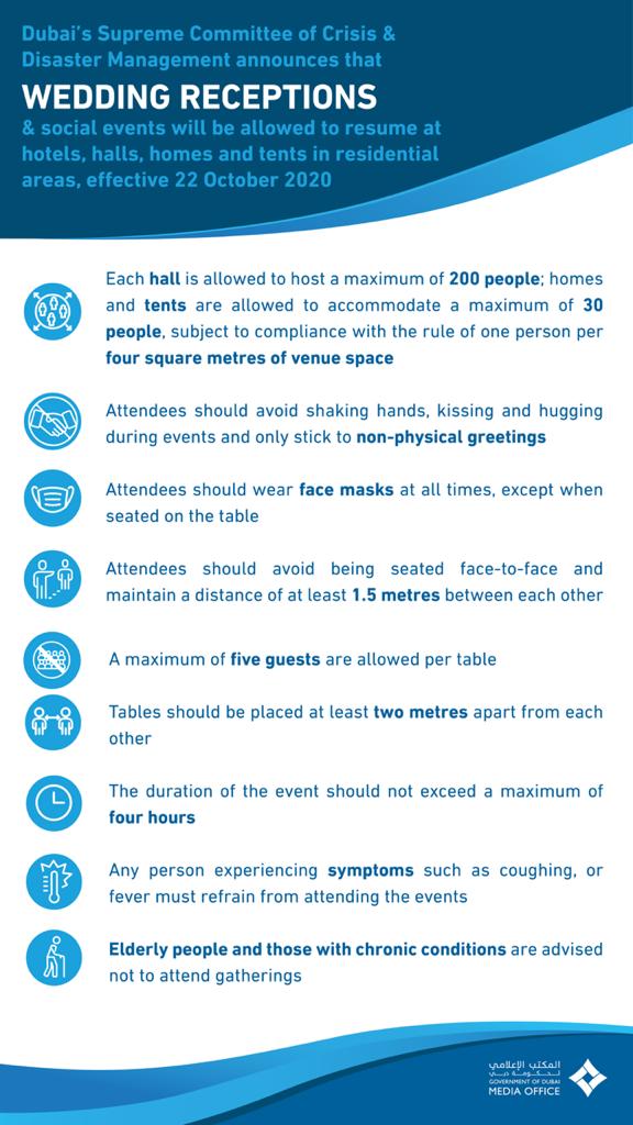The Supreme Committee of Crisis and Disaster Management in Dubai, headed by H.H. Sheikh Mansour bin Mohammed bin Rashid Al Maktoum, announced that wedding receptions will be allowed to resume in hotels, halls, homes, temporary venues, and tents in residential areas effective from 22nd October, 2020.