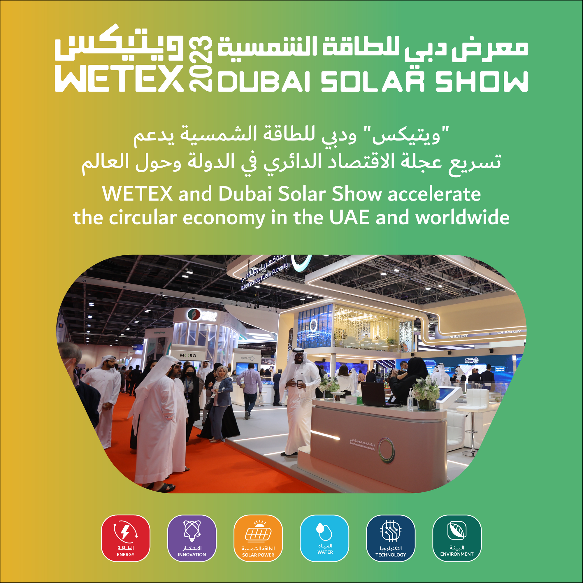 The Water, Energy, Technology, and Environment Exhibition (WETEX) and Dubai Solar Show (DSS), which is being held under the directives of His Highness Sheikh Mohammed bin Rashid Al Maktoum, Vice President and Prime Minister of the UAE and Ruler of Dubai; and under the patronage of His Highness Sheikh Ahmed bin Saeed Al Maktoum, Chairman of the Dubai Supreme Council of Energy; and organised by Dubai Electricity and Water Authority (DEWA), is a platform that sheds light on the sustainable circular economy in the UAE. It encourages global partnerships and investments to support innovation and adopt sustainable solutions and technologies in this vital field.