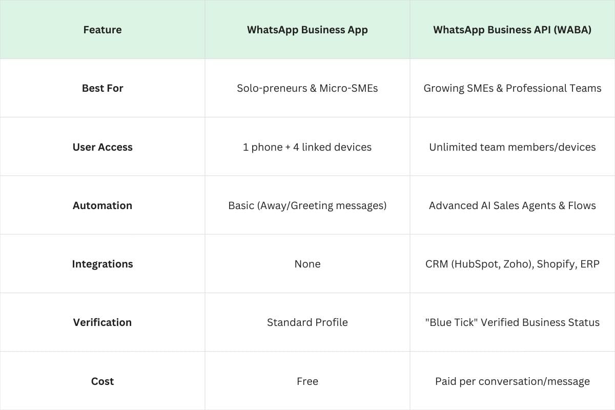 The first hurdle for any Dubai SME is choosing the right infrastructure. While the standard WhatsApp Business App is a fantastic tool for solo-preneurs and micro-businesses (like home-based bakers or freelance tutors), it has hard limits that can stifle growth. It is tethered to a limited number of devices and lacks the "brainpower" needed for high-volume automation.