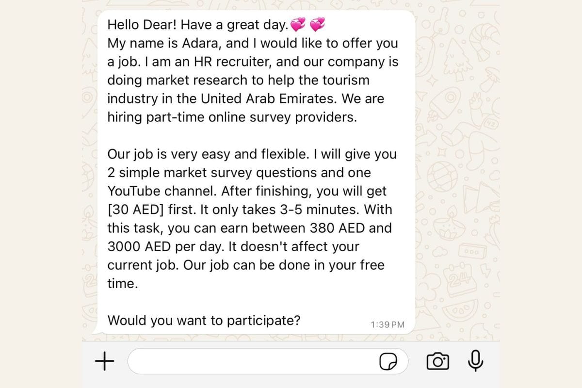 "Are you interested in a part-time job? This job is very simple. You just enter Google Maps and give a 5-star rating to some restaurants, and you will get paid. We pay Dh10-Dh400 for one task, and you can earn up to Dh2,000 per day."