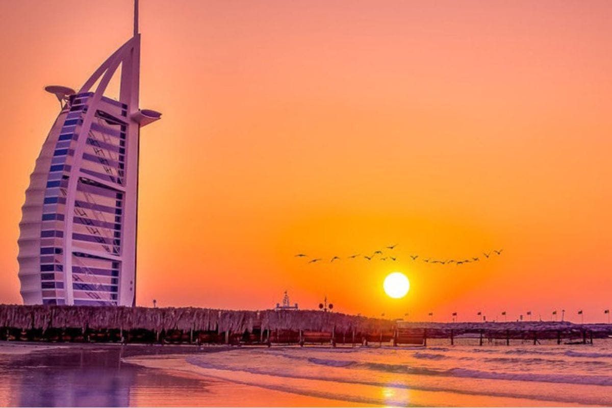 The descending sun casts golden hues over the Burj Al Arab, creating a stunning scene ideal for photography. The beach's spaciousness allows for leisurely walks along the shore, making it an ideal spot to unwind and take in the natural beauty of the sunset.