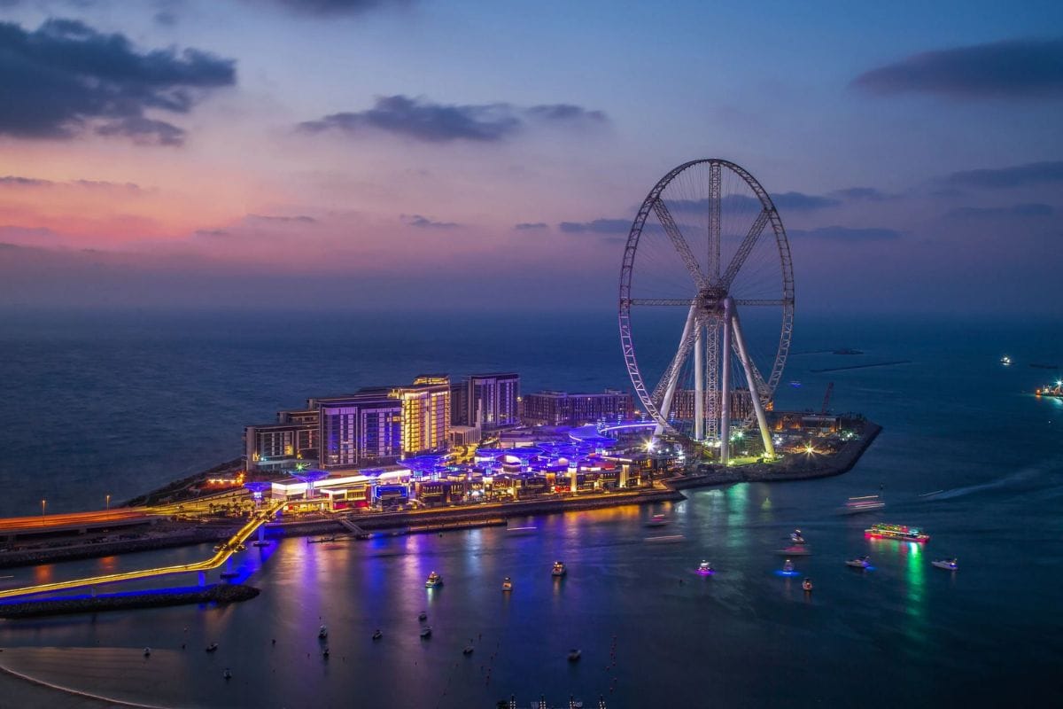 Bluewaters Island is home to Ain Dubai, the world's largest observation wheel. The island offers breathtaking sunset views, with Ain Dubai providing a striking silhouette against the colorful sky.