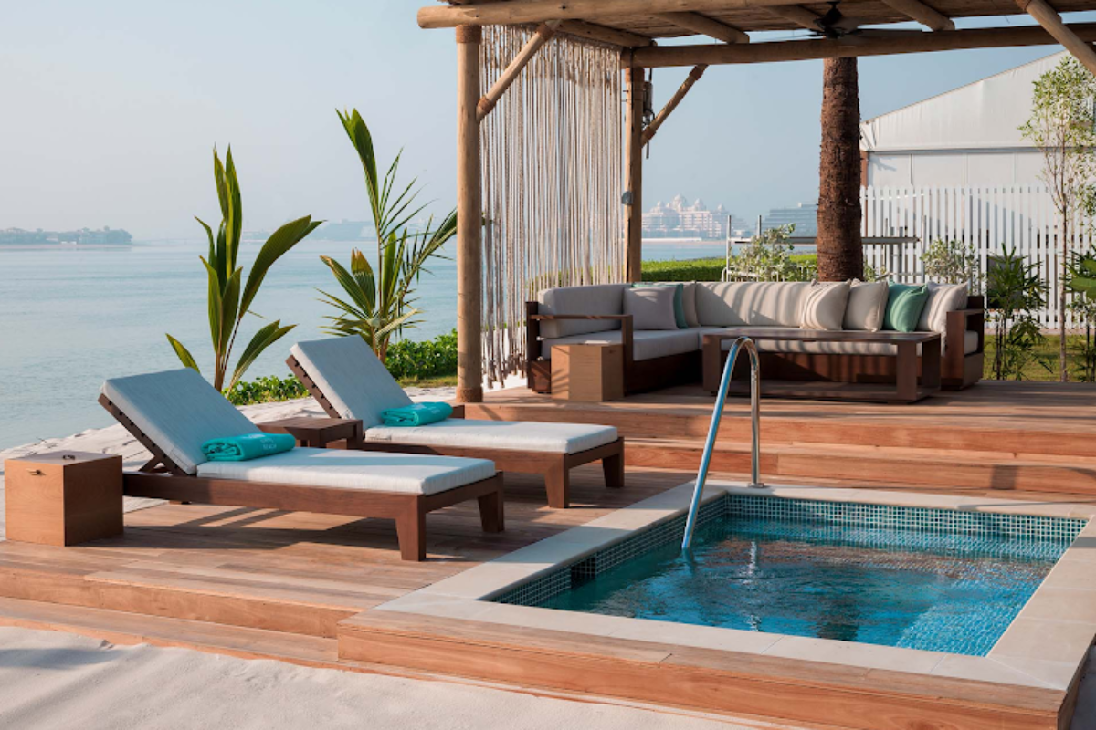 Taking it a step further than Private Pool Cabanas, the Pool Island Cabana gives guests with a larger party a chance to enjoy the fresh vibes at the White beach. As the name suggests, the Cabanas are located with easy access to the pool and even include a mini pool of their own with the booking. The Cabanas give guests sunbeds, sofas, and even a table to lounge and have a few snacks. The nature-inspired decor, supported by wooden beams and shades of wooden slates, takes the vibe up a notch truly giving you the feel of a beach club.