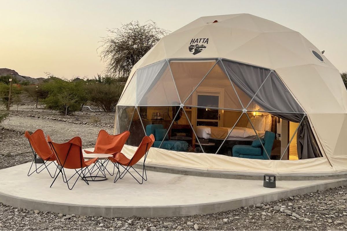 Starting from September 15, 2023, you can book a stay at Hatta's newest glamping experience. This resort offers 15 dome-shaped permanent tent structures with panoramic windows, providing breathtaking views of the Hatta mountain range.