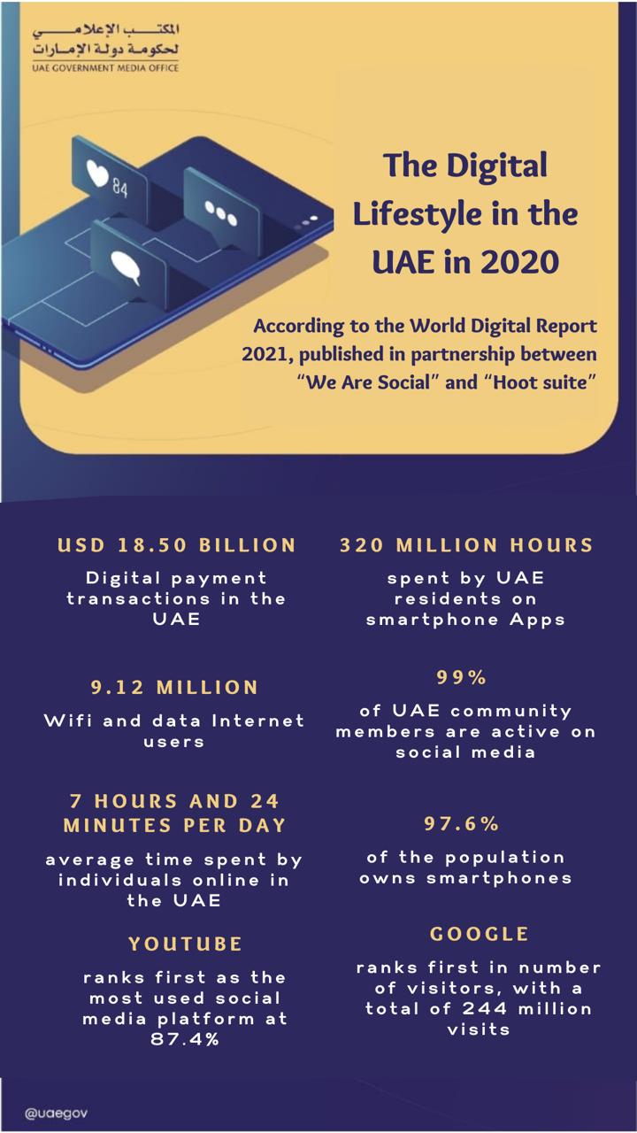 The report revealed the total value of digital payment transactions in the UAE during 2020 reached US$18.50 billion and indicated that the average time an individual spends on the Internet in the UAE is 7 hours and 24 minutes a day. Furthermore, the report states that an individual spends 40 hours per week browsing the Internet via a Smartphone, while 86 percent of the population plays electronic games via the Internet using available devices.